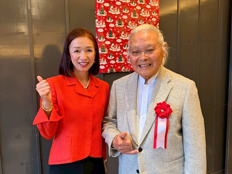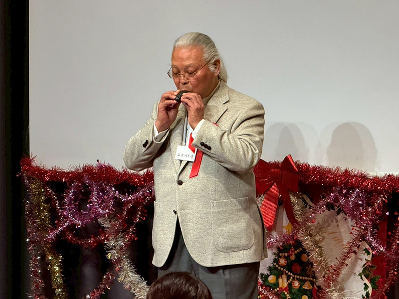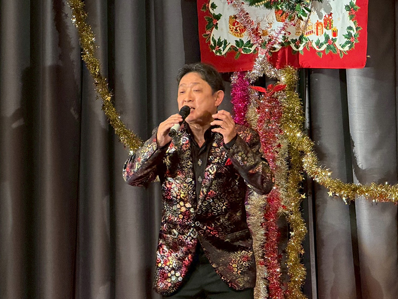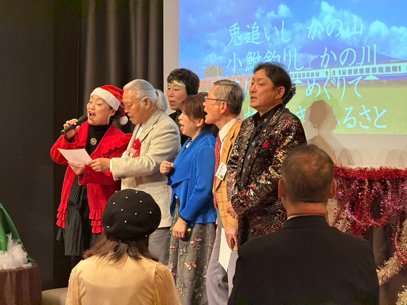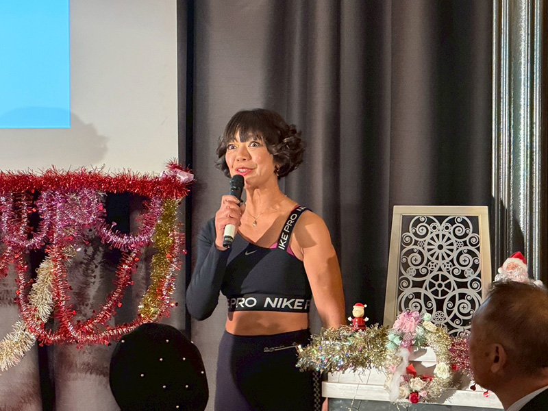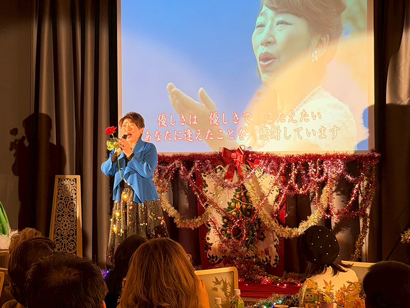 その後友情ゲスト出演として、健康増進パーソナルトレーナー なかおくみこ様に健康トレーニングについてご紹介いただきました。そして、クリスマスパーティーとして、コーラスグループ愛主催 奥眞理子様、ふれあい演歌歌手 野村真希様、歌手 草笛四郎様、演歌歌手 清水英彰様、河内音頭 平野郷三角様、プロマジシャン ジョン・道阪様ら6名の皆様にそれぞれのパフォーマンスをお楽しみいただきました。