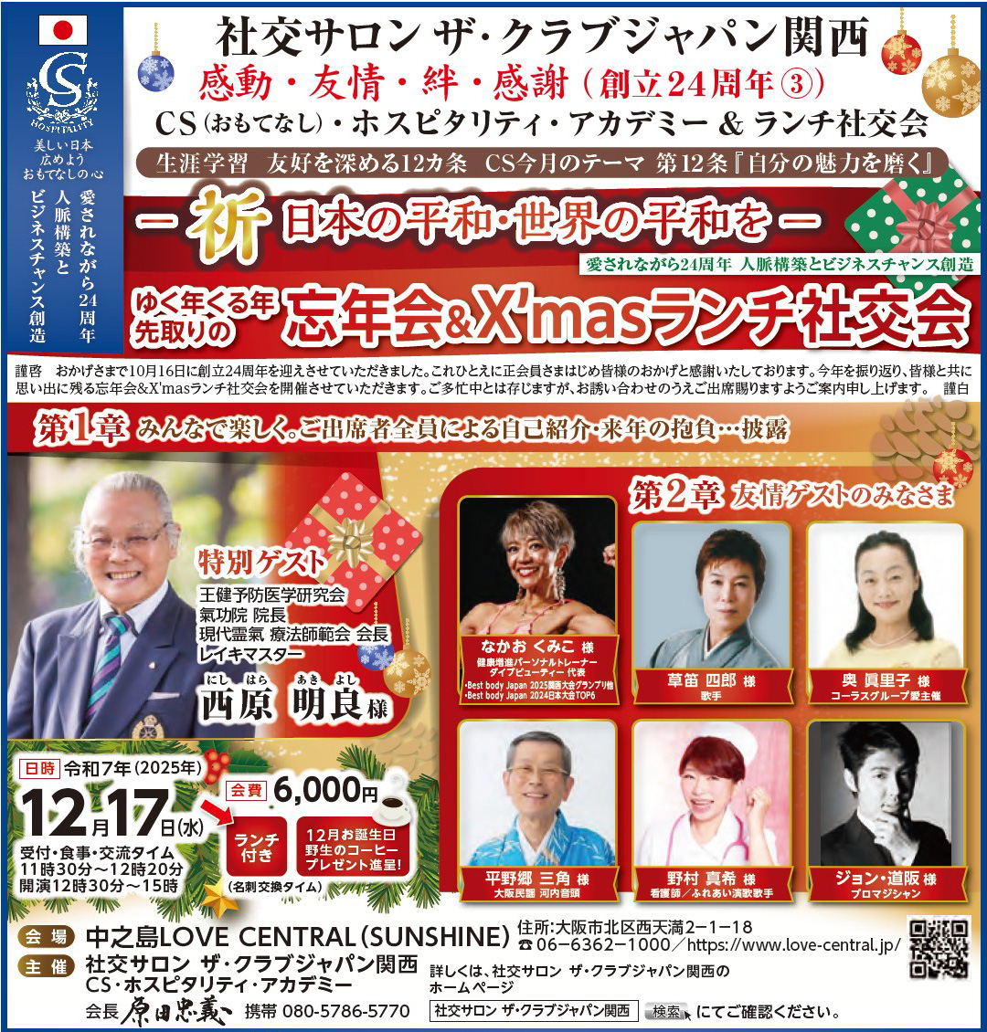 社交サロン ザ・クラブジャパン関西は令和7年12月17日(水)にラブセントラルにて約110名の方にご参加いただき、例会を執り行わせていただきました。