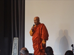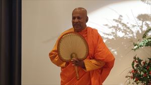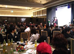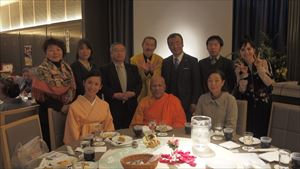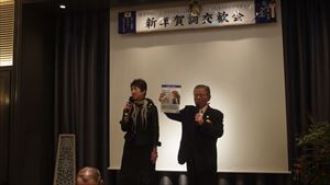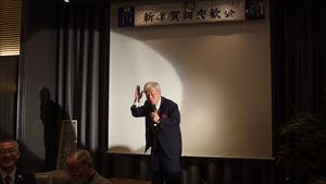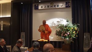 皆さま大変お忙しい中、約140名の方々にご参加いただき、恒例に基づき国歌斉唱、黙祷をささげました。そして新年の一般参賀における天皇陛下のお言葉を映像にて拝聴。原田会長による新年の挨拶ののち、友情ゲスト出演として、『日本家道山川流』家元 遠藤祐子様にご登壇いただきました。ご準備いただいた花で皆さま方に一輪ずつ生けていただき、全員で世界に一つだけの花を創作。調和し、心を一つにすることで得られるエネルギーと充足感を感じさせていただいたのです。その後、スリランカの大僧侶 ニャーナー・ランカーラ様に皆さま方の本年の心の平安を祈念してお経を唱えていただきました。また、ご来賓を代表して大阪観光局の局長の溝畑宏様には新年の祝辞を頂戴し、関西の経済の活性化に対する熱き想いで、会に華を添えていただきました。