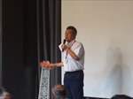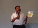 梅雨が長引く中、約130名の方々にご参加いただき開催。恒例に基づき国歌斉唱、黙祷を捧げ、原田会長より挨拶と御礼を述べさせていただきました。その後勉強会では、メイン教材「友好を深める12カ条」の第7条~フォローを大切に~について会員ジョン道坂さんに、メイン教材を講読いただき、体験から学ばれたことを発表していただきました。
