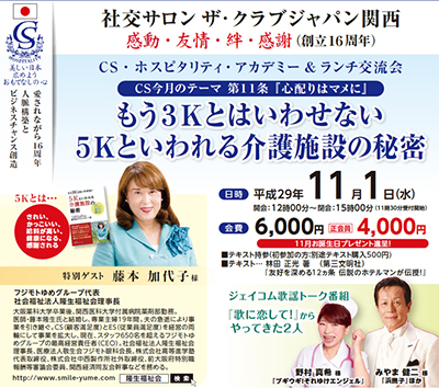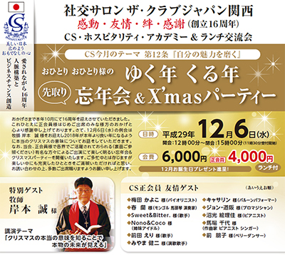 来月は12月5日には特別ゲストに一般社団法人 国際ES経営理念協会 会長の江口克彦様をお招きし「松下幸之助はなぜ成功したのか!」についてご講演いただき、CSホスピタリティー・アカデミー&ランチ交流会を執り行わせていただきます。第二部では豪華友情ゲスト出演の方々にお越しいただき、ゆく年くる年先取り忘年会&クリスマスパーティーを執り行わせていただきます。ご都合ゆるす限り、お誘いあわせの上ご出席賜りますようよろしくお願い申し上げます。