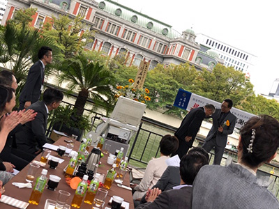 すがすがしい秋晴れの中、約170名の方々にご参加いただき開催。第一部は恒例に基づき国歌斉唱、黙祷を捧げ開会。そして発起人代表として幸南食糧株式会社 取締役会長 川西修様にご挨拶をちょうだいし、来賓代表として公益財団法人 大阪観光局理事長で大阪観光局長の溝畑宏様に当会そして関西の発展を祈念してご祝辞を賜りました。