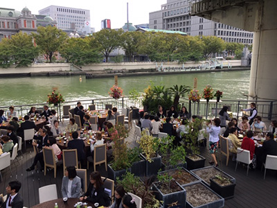 その後、テラスへ移動して第二部を開催。料理研究家の程一彦様、そして超越気功協会会長 五島秀一様に第二部開会にあたって、ご挨拶を頂戴し乾杯の音頭をとっていただきました。皆さまでお食事を召し上がっていただき、関西を盛り上げるイベントの告知を行っていただきました。プロマジシャンのジョン道坂様にはミニマジックでも会場を沸かせていただき、そして10月がお誕生月の皆さまをお祝いさせていただきました。