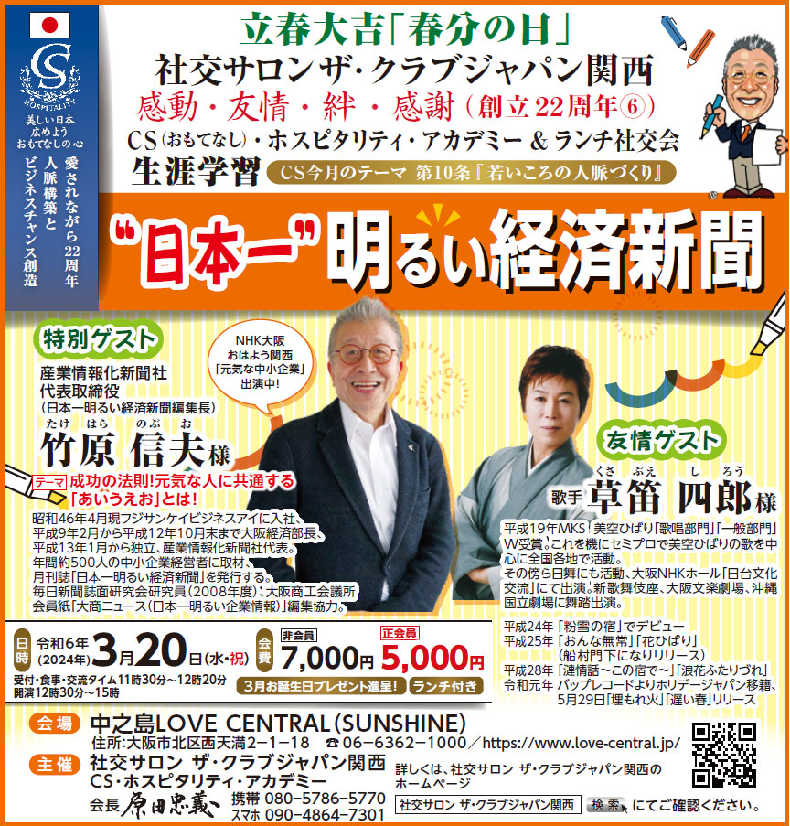 次回は4月17日(水)社交サロン ザ・クラブジャパン関西は152回CSホスピタリティ・アカデミー&ランチ社交会を開催いたします。特別ゲストにフリーアナウンサーの中原秀一郎様をお招きし、アナウンサーとして朝日放送在職42年の「心に響く言葉」テーマでご講演いただきます。また春の心地よい気候の中、中之島中央公会堂を対岸に臨むリバーサイドテラスにてお食事をとりながらご歓談いただきます。