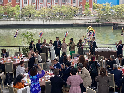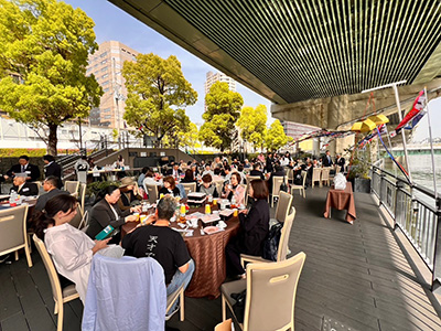 そして、第二部ではテラスに移動してお食事と歓談を行っていただきました。そこで4月のお誕生月のお祝い。会員様によりカヌレの試食や川沿いを通るフェリーのチケットプレゼントをいただきました。能登半島地震への支援として淡路島の新玉ねぎをみなさまにご購入いただき、集まった資金を義援金とさせていただきました。