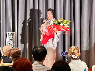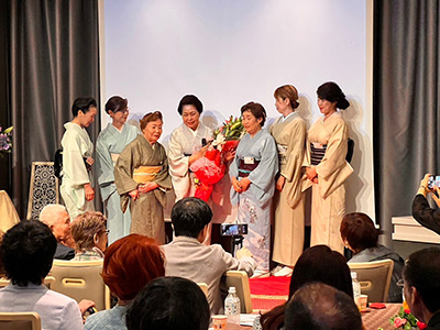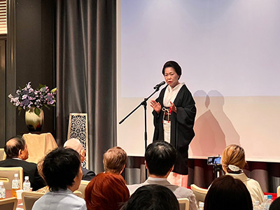 特別ゲスト講演では、着物デザイナー あいむプロ代表 渋谷幸子様に「昔と今に見る女性の生き方」というテーマでご講演いただきました。体系を露わにしない着物は世界で唯一無二の隠す美学である。それは農耕民族であった日本人の文化や生き方と深くかかわりながら、受け継がれ進化してきており、不自由さから来るしなやかな動きも独特な光を放っている。様々な障壁を乗り越えて、75歳で法人化させたのは人々に少しでもお役に立ちたいという生き様の現れでありました。おしとやかな女性らしさと、凛とした人や物事に対する姿勢、双方掛け合わせた姿こそ着物にふさわしくまさにやまとなでしこと呼ばれるものであることが伝わってきました。