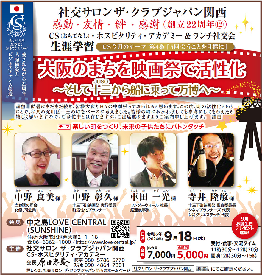 次回は10月16日(水)社交サロン ザ・クラブジャパン関西は創立23周年を迎えた感謝の集い、第158回CSホスピタリティ・アカデミー&ランチ社交会を開催いたします。特別ゲストにオフィスM&K 草笛雅子様にお越しいただき、「出逢いは宝物」というテーマでトーク&ショーを行っていただきます。こうしてまた一年の活動を積み重ねていけるのもご参加いただいたり、ご支援いただいている皆さまのおかげ様です。