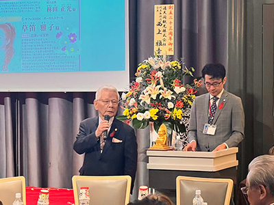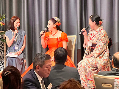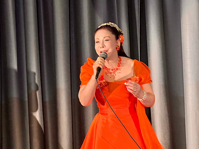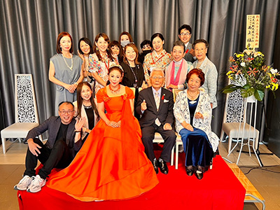 特別ゲスト出演では、オフィスM&K ボーカルスクールの草笛雅子様にご登壇いただきました。当会常任幹事の優希瞳さん、松本典子さんと共にこれまでの人生の歩みや宝塚歌劇団で学んだことをお話しいただきました。「信頼・尊敬・責任」を大切にする。ユーモアあふれる会話の中から、人に導かれた道で筋を通して乗り越えてきた草笛様の生き様が感じられました。その後、ミニコンサートとして3曲うたっていただきました。魂を震わせるほどの歌声は皆様の心に響き、この23周年を共にお祝いできる時間を包んでいただきました。