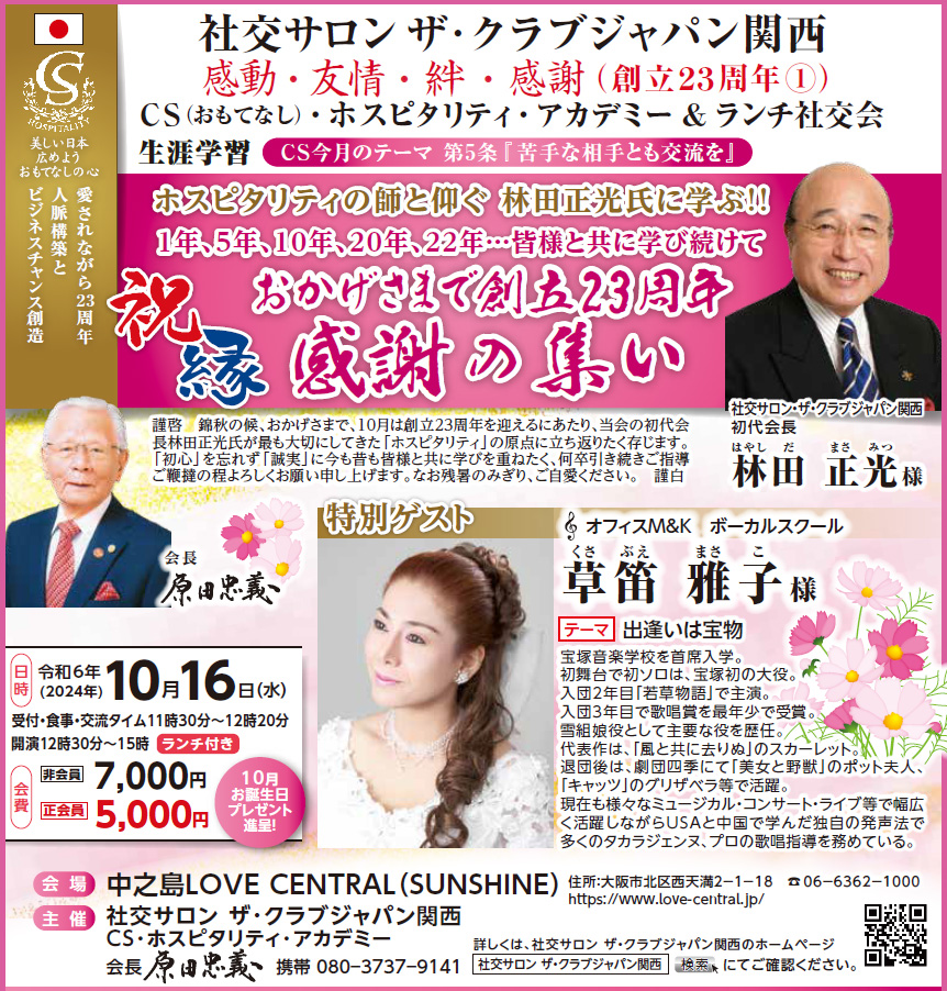 社交サロン ザ・クラブジャパン関西は令和6年10月16日(水)にラブセントラルにて創立23周年の感謝の集いを執り行わせていただきました。