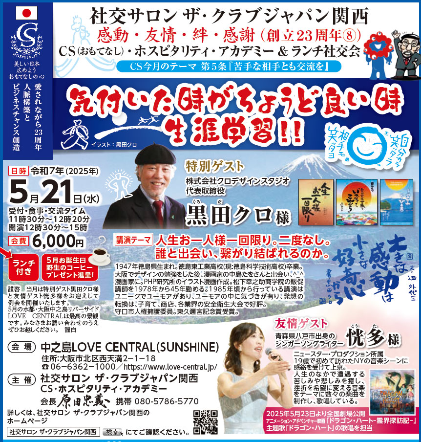 次回は6月18日(水)社交サロン ザ・クラブジャパン関西 第166回CSホスピタリティ・アカデミーを開催いたします。特別ゲストには禮のこと教室 主宰の森日和様をお招きし、「礼儀作法は子どもたちの応援団・そして、礼儀作法で国護り」というテーマでご講演いただきます。また友情ゲストとして、ゴマジェットカフェの山本恭裕様お招きいたします。