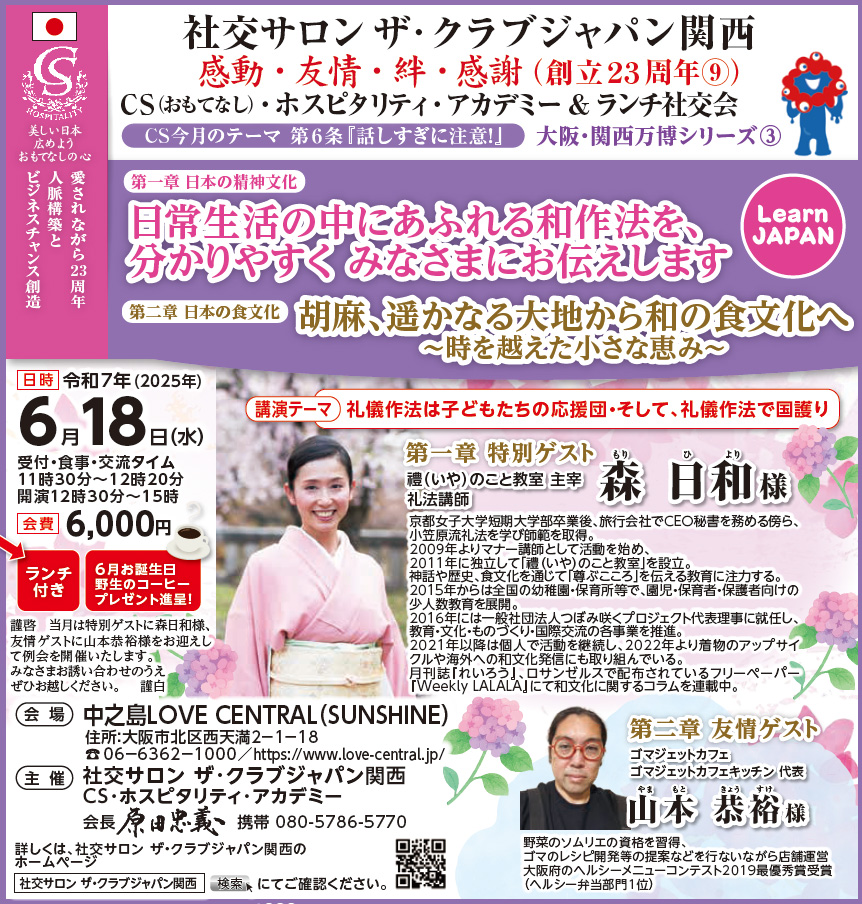 次回は7月16日(水)社交サロン ザ・クラブジャパン関西 第167回CSホスピタリティ・アカデミーを開催いたします。特別ゲストには一般社団法人 関西ウクライナ友好協会の皆様をお招きし、「この地球の子供たちに、平和な未来を・・・」というテーマでご講演いただきます。今なお続く戦争の現実に触れ、平和について考える時間とさせていただきたいと思います。ご都合ゆるす限り、お誘いあわせの上ご出席賜りますようよろしくお願い申し上げます。